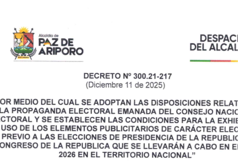 La Administración Municipal emitió el Decreto N° 300.21-217 del 11 de diciembre de 2025, “Por medio del cual se adoptan las disposiciones relativas a la propaganda electoral emanada del consejo nacional electoral y se establecen las condiciones para la exhibición y el uso de los elementos publicitarios de carácter electoral previo a las elecciones de presidencia de la república y congreso de la república que se llevarán a cabo en el año 2026 en el territorio nacional"