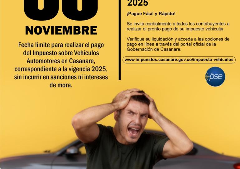 La Secretaría de Hacienda departamental recuerda a los propietarios de vehículos automotores matriculados en el departamento que el 30 de noviembre de 2025 vence el plazo para realizar el pago del impuesto sobre vehículos automotores correspondiente a la vigencia 2025, sin incurrir en sanciones ni intereses de mora.