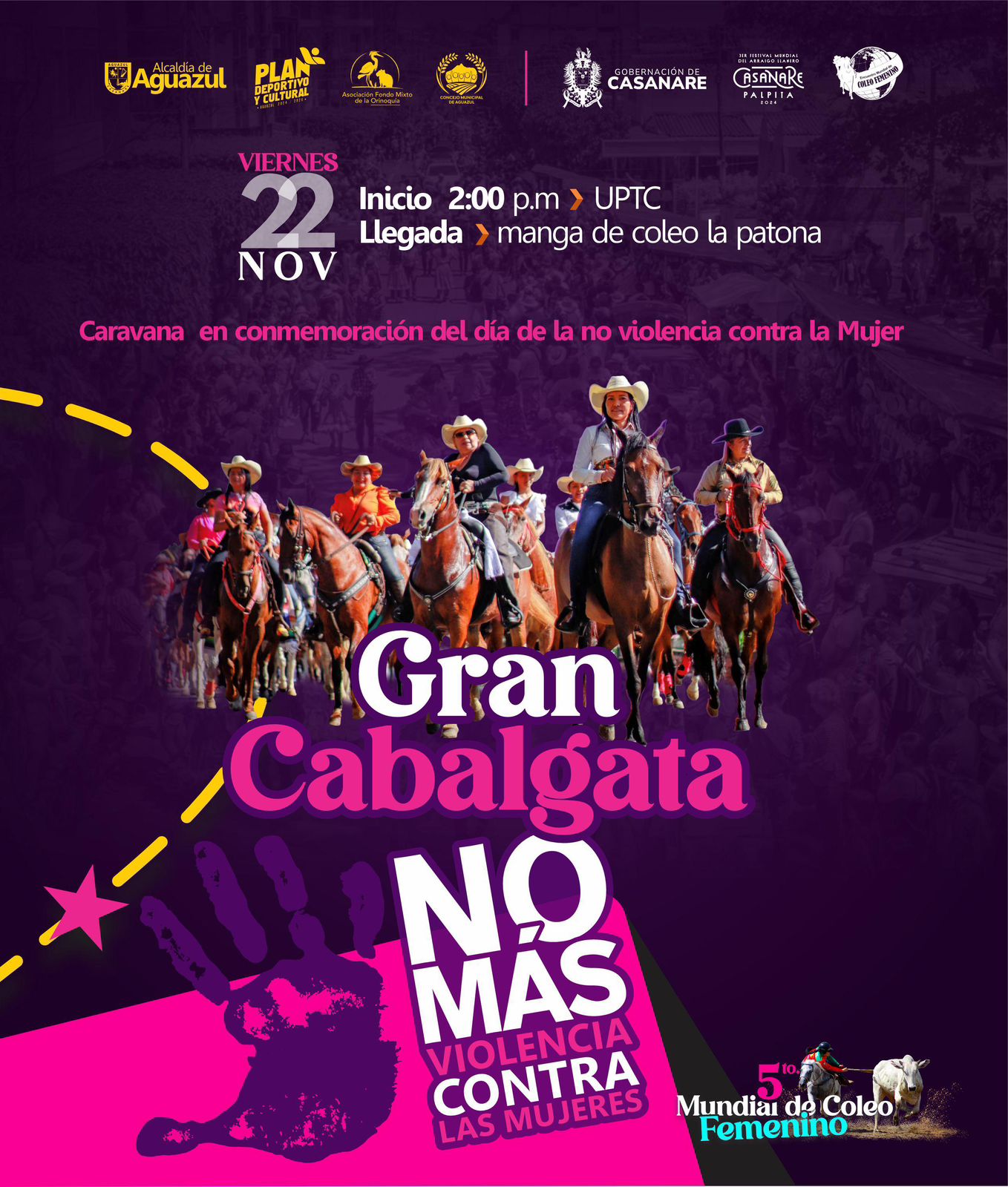 Este viernes, 22 de noviembre, el municipio de Aguazul se prepara para ser el escenario de la Gran Cabalgata de Casanare Palpita 2024, un evento lleno de tradición y significado que, por primera vez se llevará a cabo en este municipio. En conmemoración del Día de la No Violencia contra la Mujer, cerca de 2.000 caballistas engalanarán las principales calles, rindiendo homenaje a las raíces y tradiciones llaneras.