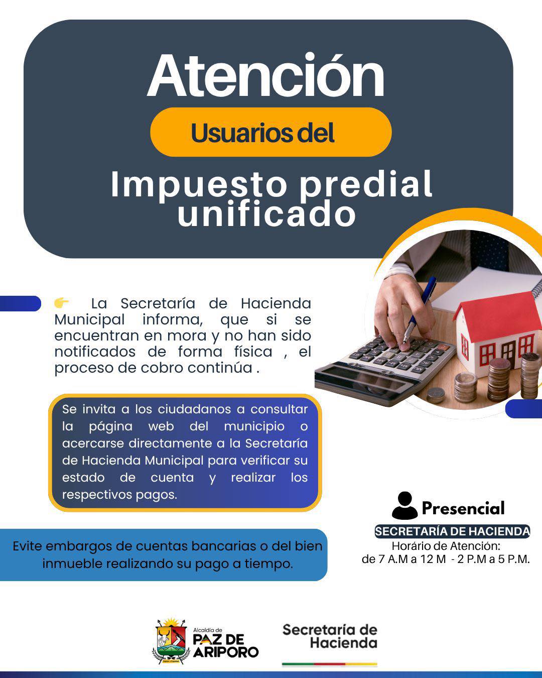 La Secretaría de Hacienda Municipal informa a los contribuyentes del Impuesto Predial Unificado que se encuentren en mora y que no hayan sido notificados de manera física, que continúa el proceso de cobro.