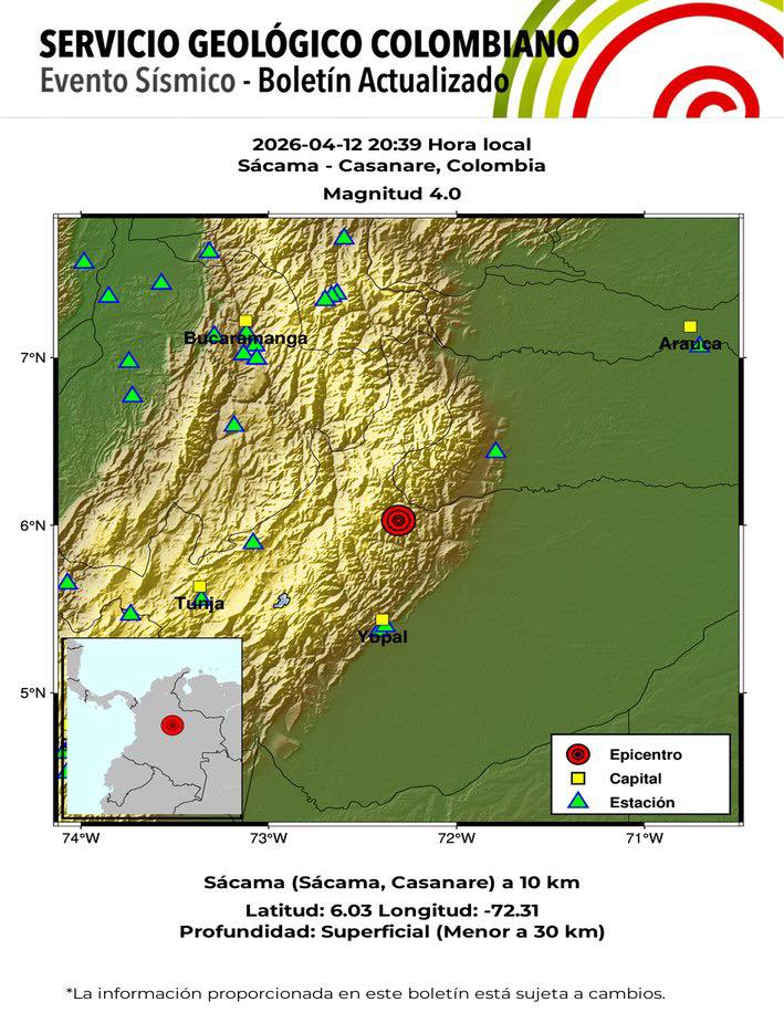 El Servicio Geológico Colombiano reportó el día de ayer dos temblores con epicentro en el municipio de Sácama - Casanare.