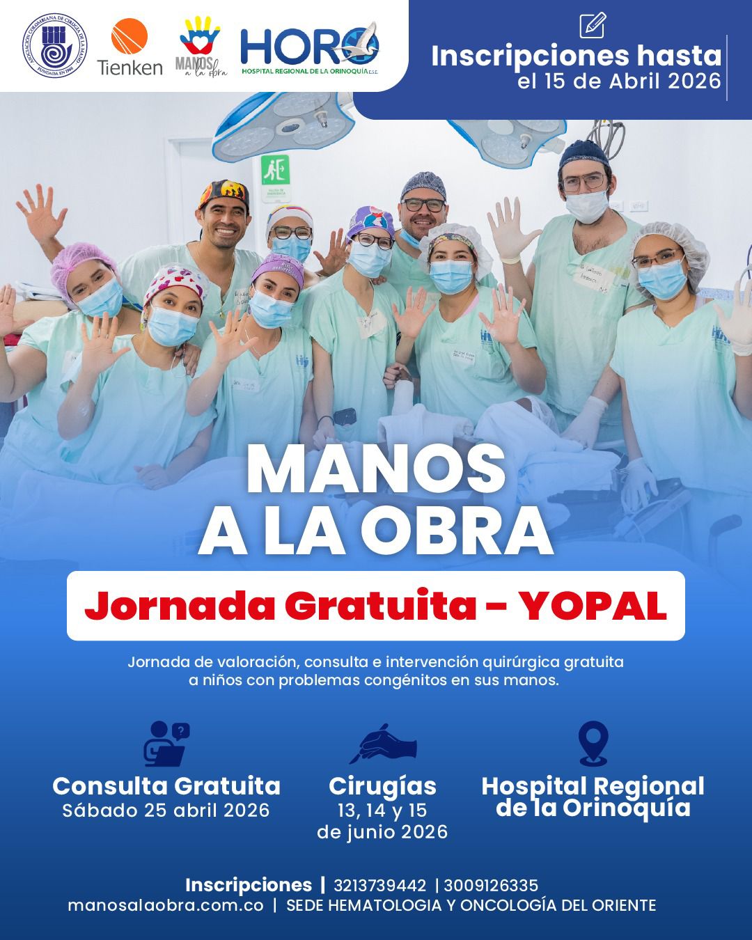 Las cirugías se llevarán a cabo los días 13, 14 y 15 de junio de 2026, en las instalaciones del Hospital Regional de la Orinoquía, con la participación de cirujanos nacionales e internacionales, anestesiólogos e instrumentadores quirúrgicos que se vinculan de manera voluntaria a esta causa.