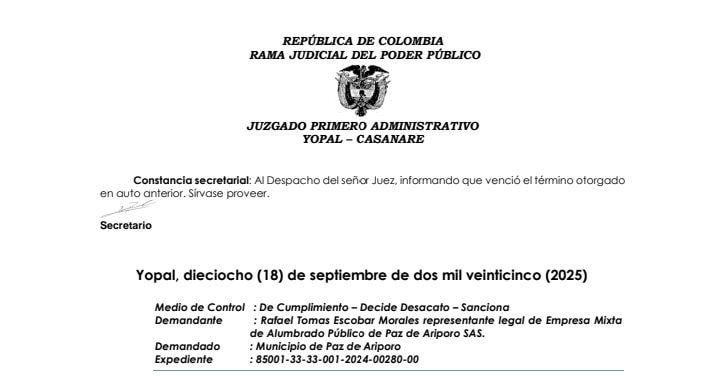 El Juzgado Primero Administrativo de Yopal, en auto del 18 de septiembre, sancionó al alcalde de Paz de Ariporo, por desacatar una sentencia que le ordenaba transferir los recursos recaudados por concepto del impuesto de alumbrado público a la Empresa Mixta de Alumbrado Público de Paz de Ariporo S.A.S. La decisión judicial, emitida el 13 de febrero de 2025 y confirmada por el Tribunal Administrativo de Casanare, establecía que el mandatario debía girar la totalidad de los fondos sin descuentos ni interpretaciones administrativas.