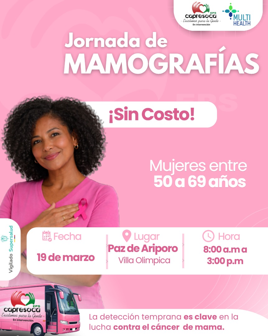 Se invita a usuarias de Capresoca EPS, de entre 50 y 69 años, a participar en las jornadas de toma de mamografías programadas esta semana en los municipios de Pore, Monterrey, Paz de Ariporo, Yopal y Nunchía, para que soliciten este examen gratuito, de detección oportuna del cáncer de mama.