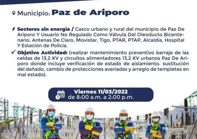 Enerca programó para esta semana varios cortes en el servicio de energía, para el caso de Paz de Ariporo se tiene programad...