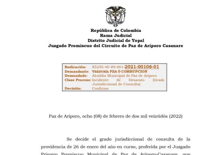 El Juzgado Promiscuo del Circuito de Paz de Ariporo, emitió el fallo en el que confirma la decisión proferida el pasado 26 ...