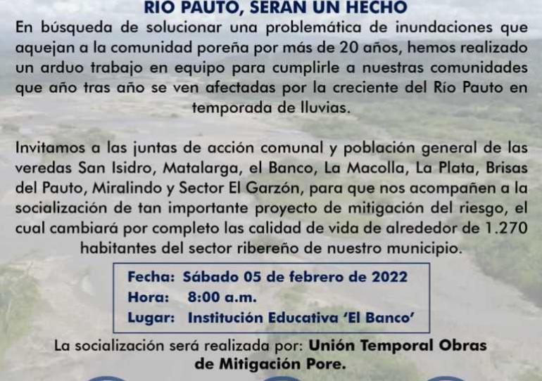 La administración municipal de Pore, invita a la comunidad de las veredas de San Isidro, Matalarga, El Banco, La Macolla, La Plata, Brisas del Pauto, Miralindo y...
