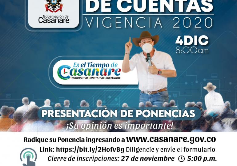 Hasta el 27 de noviembre los casanareños podrán inscribir sus ponencias en línea, en el marco de la audiencia pública de rendición de cuentas de la Administración departamental, vigencia 2020.