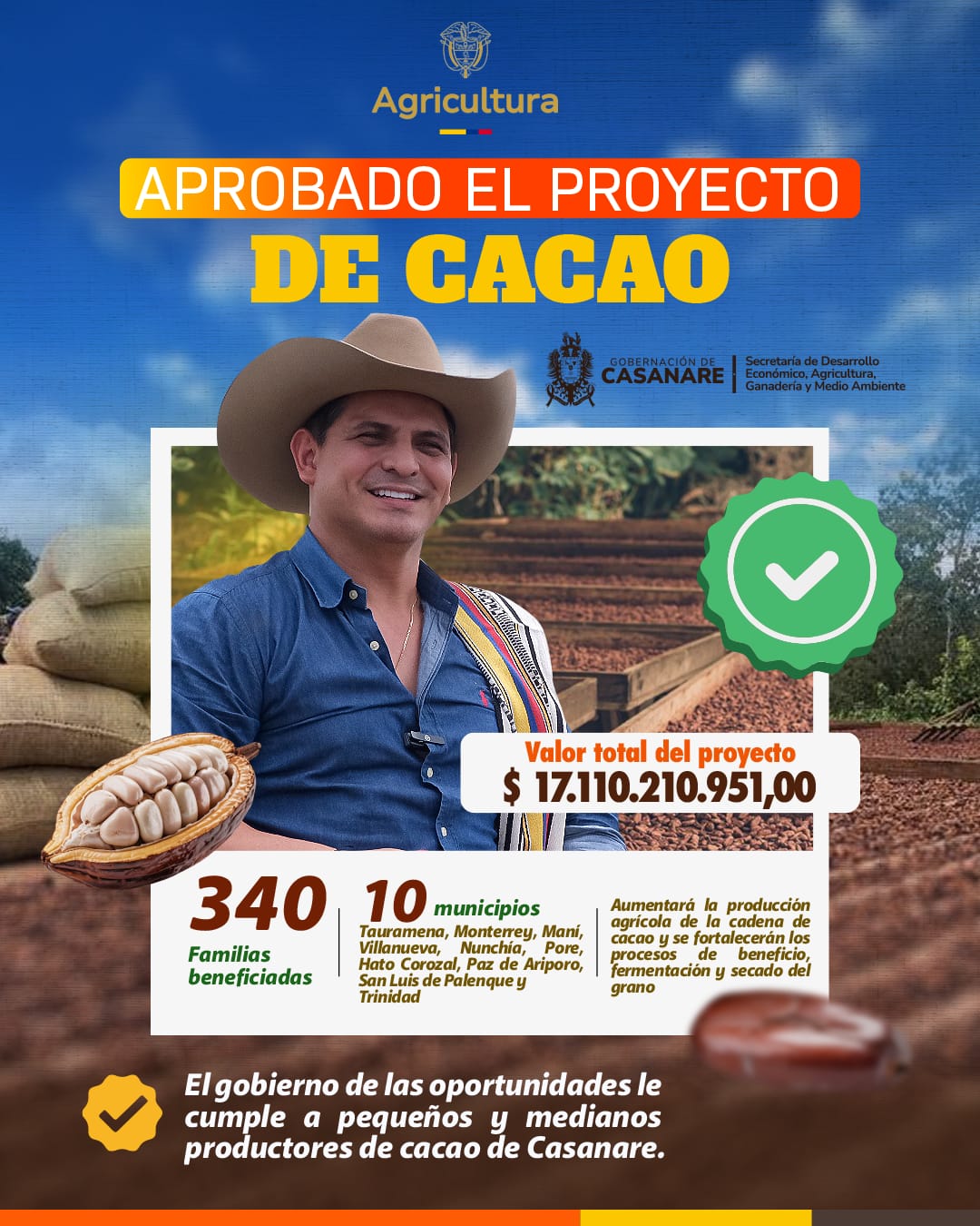 La Gobernación de Casanare a través de la Secretaría de Desarrollo Económico Agricultura Ganadería y Medio Ambiente anunció la aprobación de los recursos por parte del Ministerio de Agricultura para el proyecto de fortalecimiento de la cadena productiva de cacao para mejorar la producción en sistemas agrícolas de pequeños y medianos productores del departamento de Casanare.