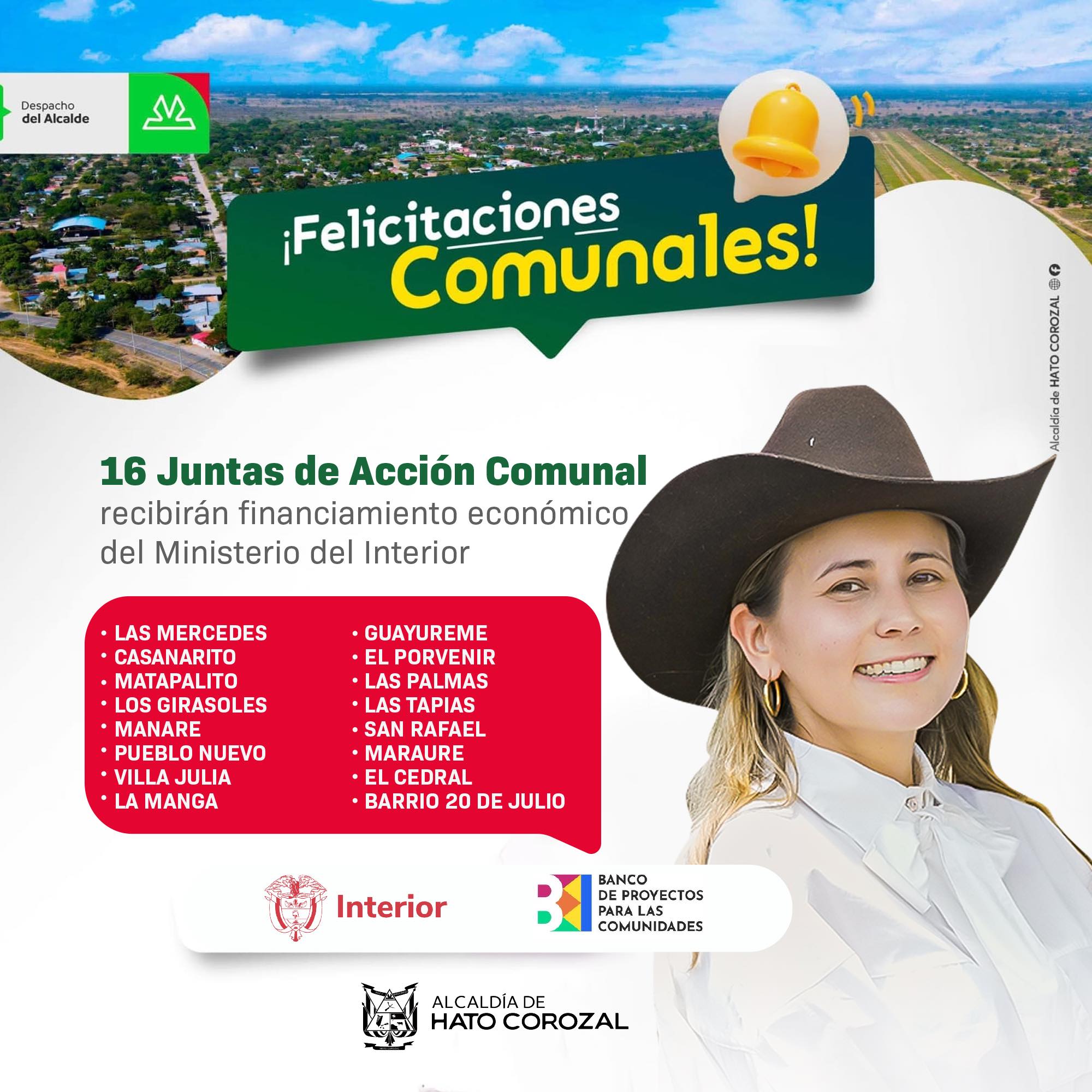 El trabajo articulado entre las Juntas de Acción Comunal y la Alcaldía de Hato Corozal, permitió presentar propuestas al Banco de Proyectos del Ministerio del Interior, logrando que 16 JAC accedan a recursos para fortalecer sus iniciativas comunitarias.