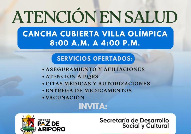 La Administración Municipal desde la Secretaría de Desarrollo Social y Cultural, invitan a la ciudadanía del Municipio de Paz de Ariporo a una Jornada de Salud con las entidades prestadoras de servicios de salud, bajo el organismo regulador de inspección y vigilancia al sistema de salud Supersalud, quien protege los derechos de los ciudadanos y asegura el cumplimiento de las normas.