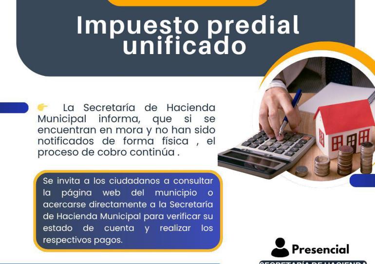La Secretaría de Hacienda Municipal informa a los contribuyentes del Impuesto Predial Unificado que se encuentren en mora y que no hayan sido notificados de manera física, que continúa el proceso de cobro.
