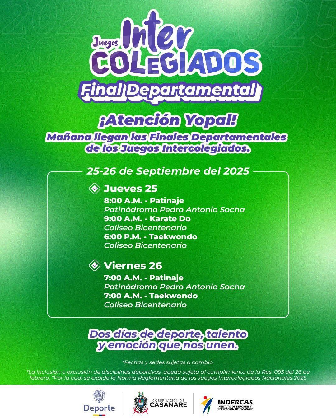 El Instituto para la Recreación y el Deporte (Indercas) anuncia que los días jueves 25 y viernes 26 de septiembre se celebrará la final departamental de los Juegos Intercolegiados en Yopal para los deportes de Karate Do, Taekwondo y Patinaje.