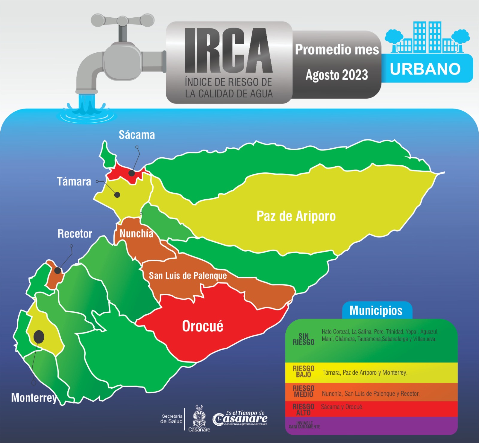 La Secretaría de Salud de Casanare da a conocer a la comunidad los resultados del monitoreo al Índice de Riesgo de la Calidad de Agua (IRCA) para las áreas urbanas de Casanare, información recolectada en el mes de agosto del año 2023.