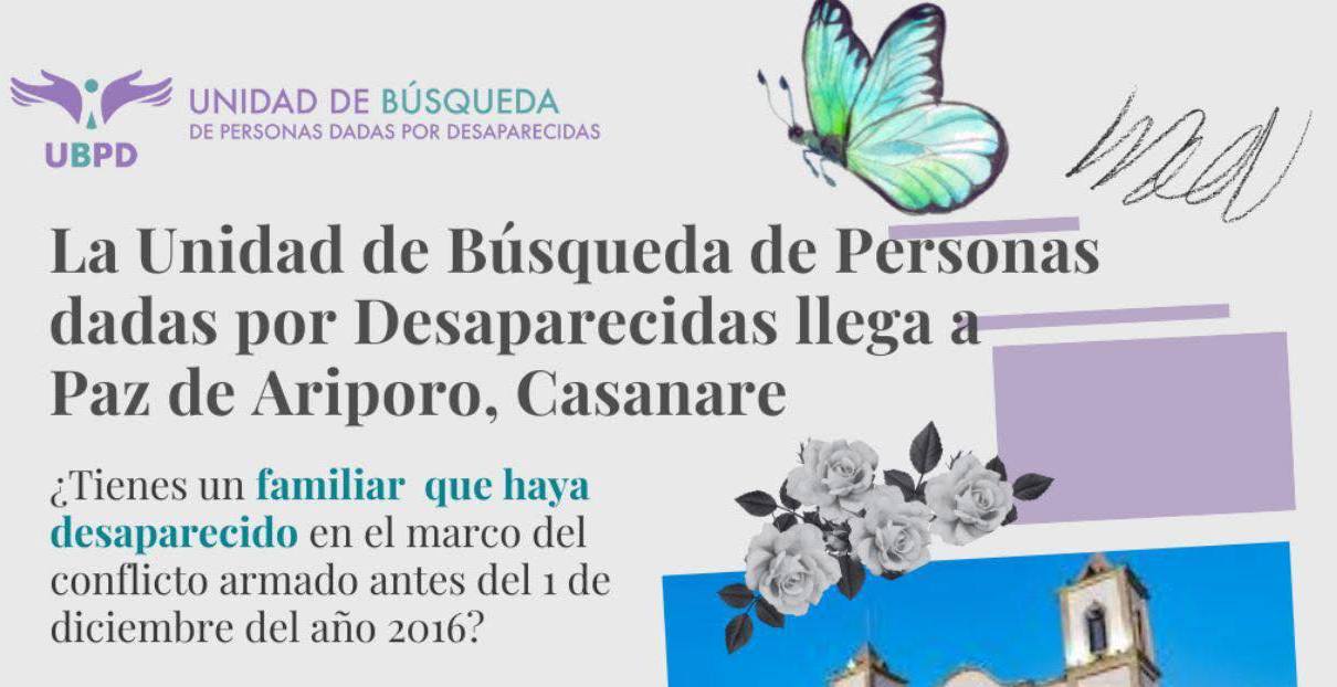 Este 21 y 22 de octubre, la Unidad de Búsqueda de Personas dadas por Desaparecidas (#UBPD), estará en #PazDeAriporo con el objetivo de recolectar información que permita apoyar el proceso de búsqueda de personas perdidas y cuya ausencia, se halla registrado en el marco del conflicto armado perpetrado antes del 1 de diciembre de 2016.