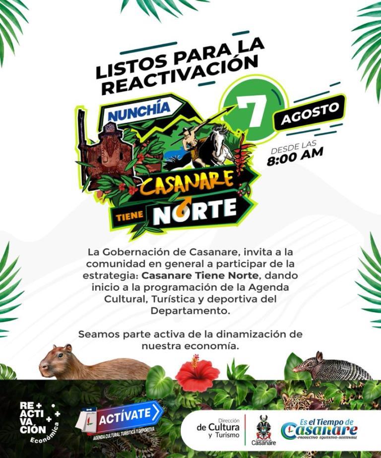 La Gobernación de Casanare y la Dirección Departamental de Cultura y Turismo extienden la invitación a toda la comunidad casanareña, para que el próximo sábado el destino a visitar sea el municipio de Nunchía, donde se dará apertura a la Agenda Cultural, Deportiva y Turística, estrategia enfocada a reactivar la economía a través de diferentes eventos en los municipios del departamento.