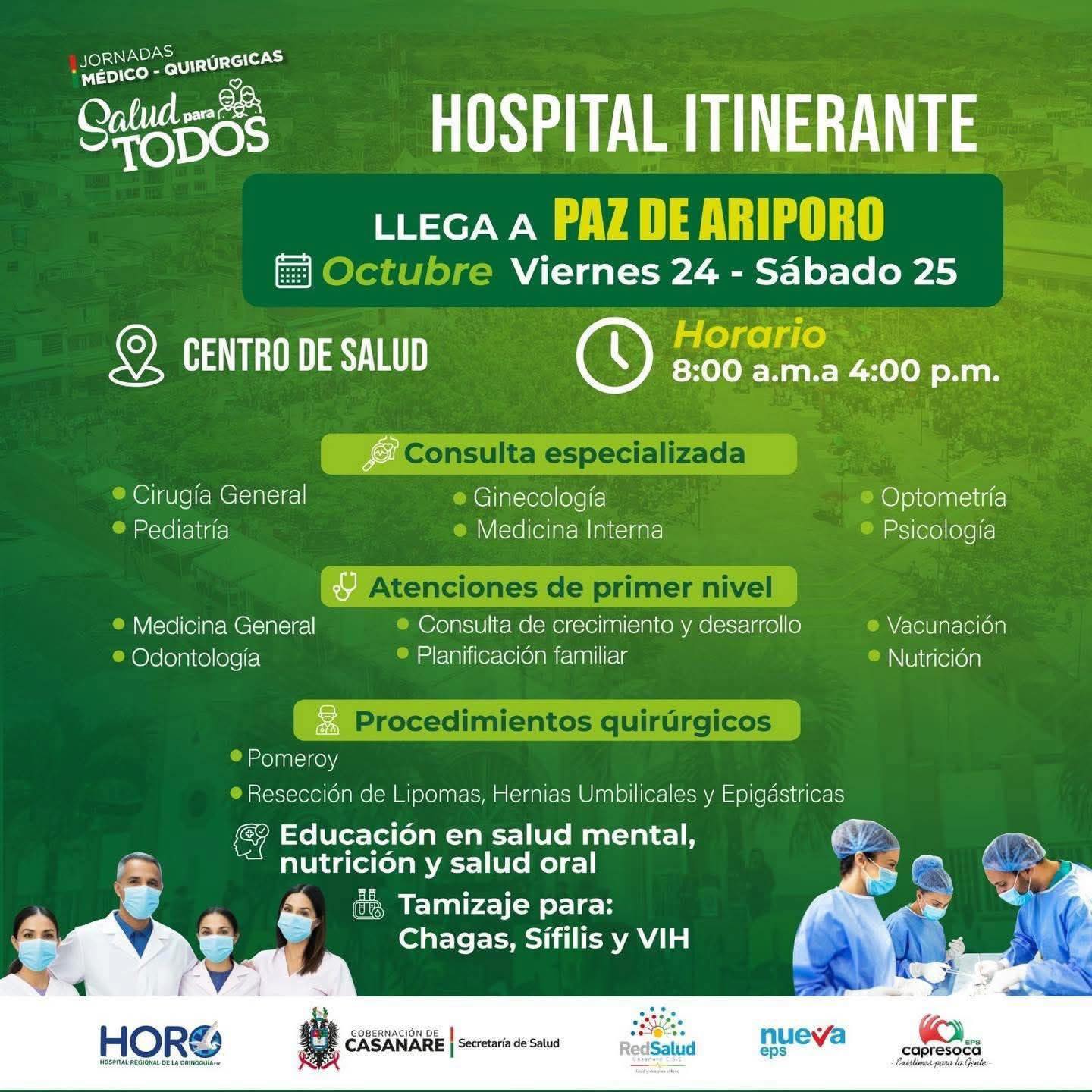 La Gobernación de Casanare en articulación con la Secretaría de Salud Departamental, el Hospital Regional de la Orinoquía E.S.E y Red Salud Casanare, organizan e invitan a la gran jornada en salud y atención avanzada del Hospital Itinerante, los próximos 24 y 25 de octubre.