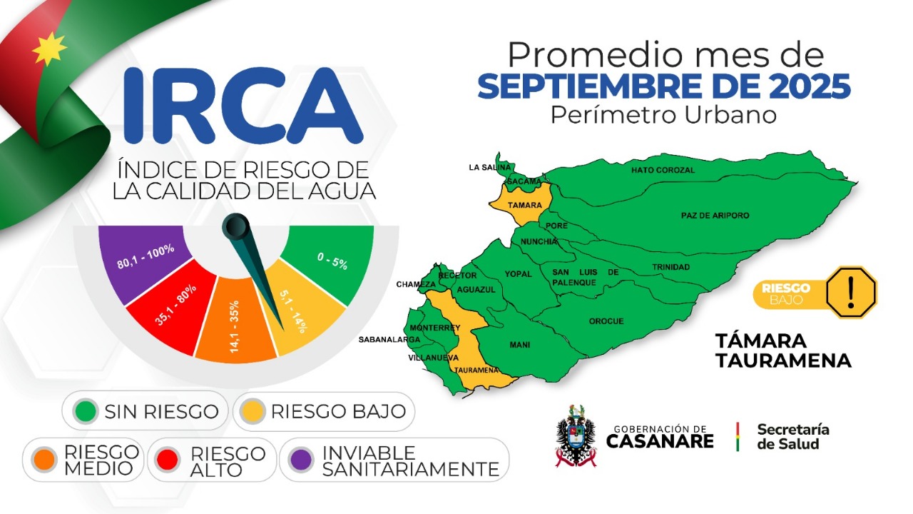 En cumplimiento de lo establecido por la Resolución 2115 de 2007, la Secretaría de Salud, da a conocer a la comunidad del departamento los resultados del monitoreo al índice de Riesgo de la Calidad de Agua (IRCA) para las áreas urbanas de Casanare, en los que se tuvo en cuenta información recolectada en el mes de septiembre del año 2025.