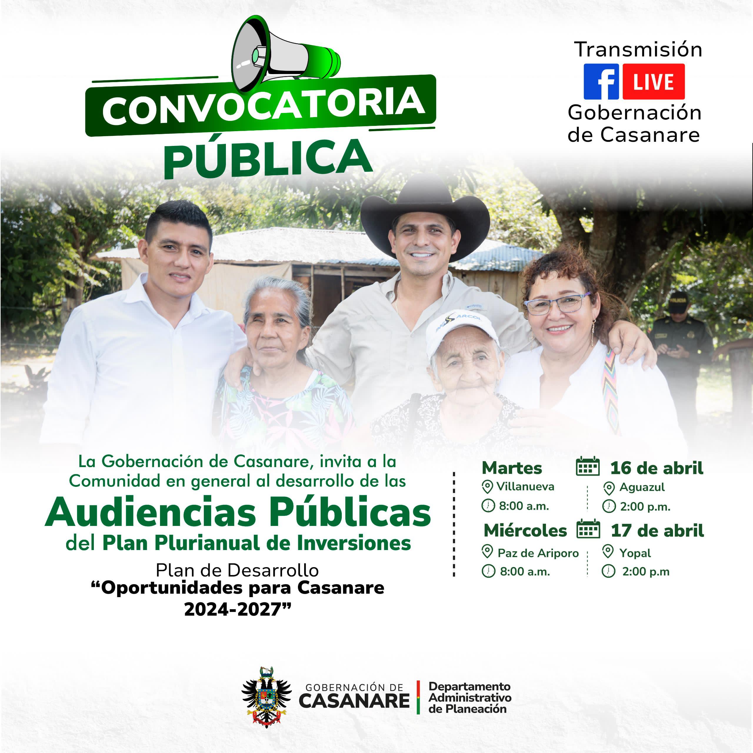 En cumplimiento de la Ley 1909 de 2018 “Por medio de la cual se adopta el estatuto de la oposición política y algunos derechos a las organizaciones políticas independientes”, en el artículo 22 denominado Transparencia y rendición de cuentas en el Plan de Desarrollo y Planes Plurianuales de Inversión, se define la obligación de adelantar una audiencia pública, con el fin de socializar el Plan Plurianual de Inversiones de los planes de desarrollo, la Gobernación de Casanare invita a la ciudanía a participar de las Audiencias Públicas del Plan Plurianual de Inversiones 2024-2027 que busca la participación activa de la comunidad en la definición de las principales propuestas de inversiones del Departamento.