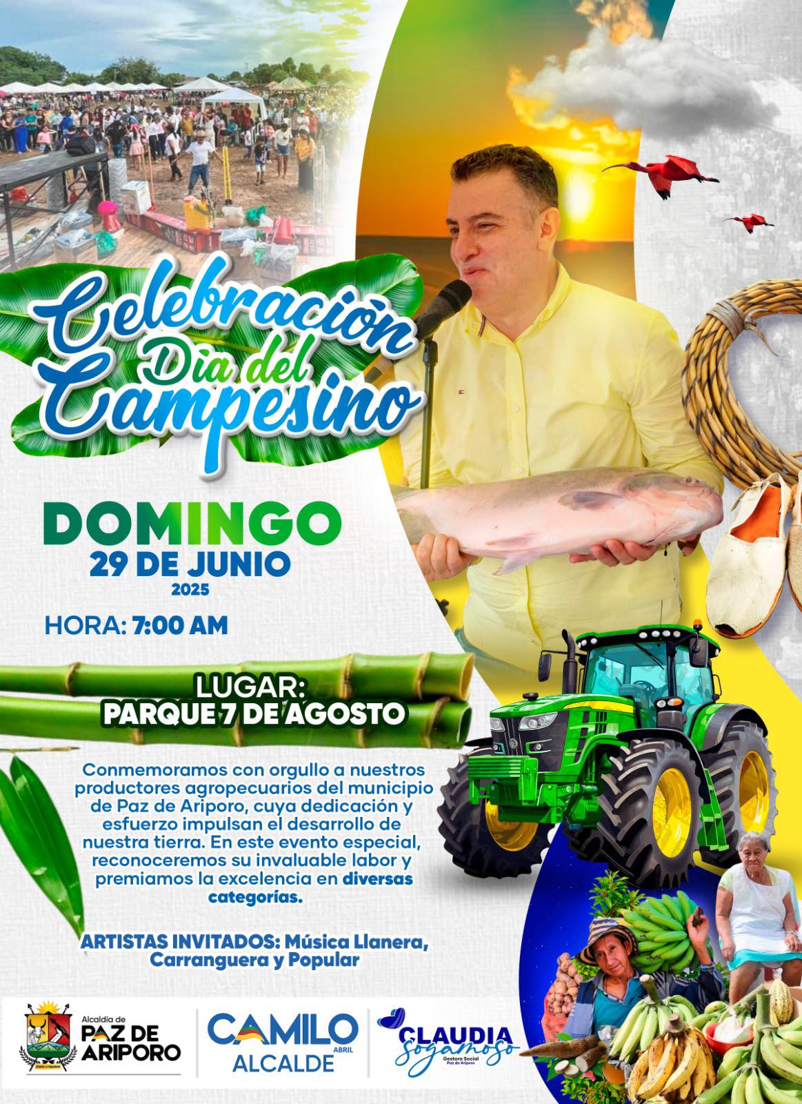 La Administración Municipal de Paz de Ariporo, en cabeza del alcalde Camilo Abril Tarache, la gestora social Claudia Sogamoso y la secretaría de desarrollo económico y ambiental, invitan cordialmente a toda la comunidad en general a la gran celebración del Día del Campesino, que se llevará a cabo este domingo 29 de junio, desde las 7:00am en el Parque 7 de agosto.