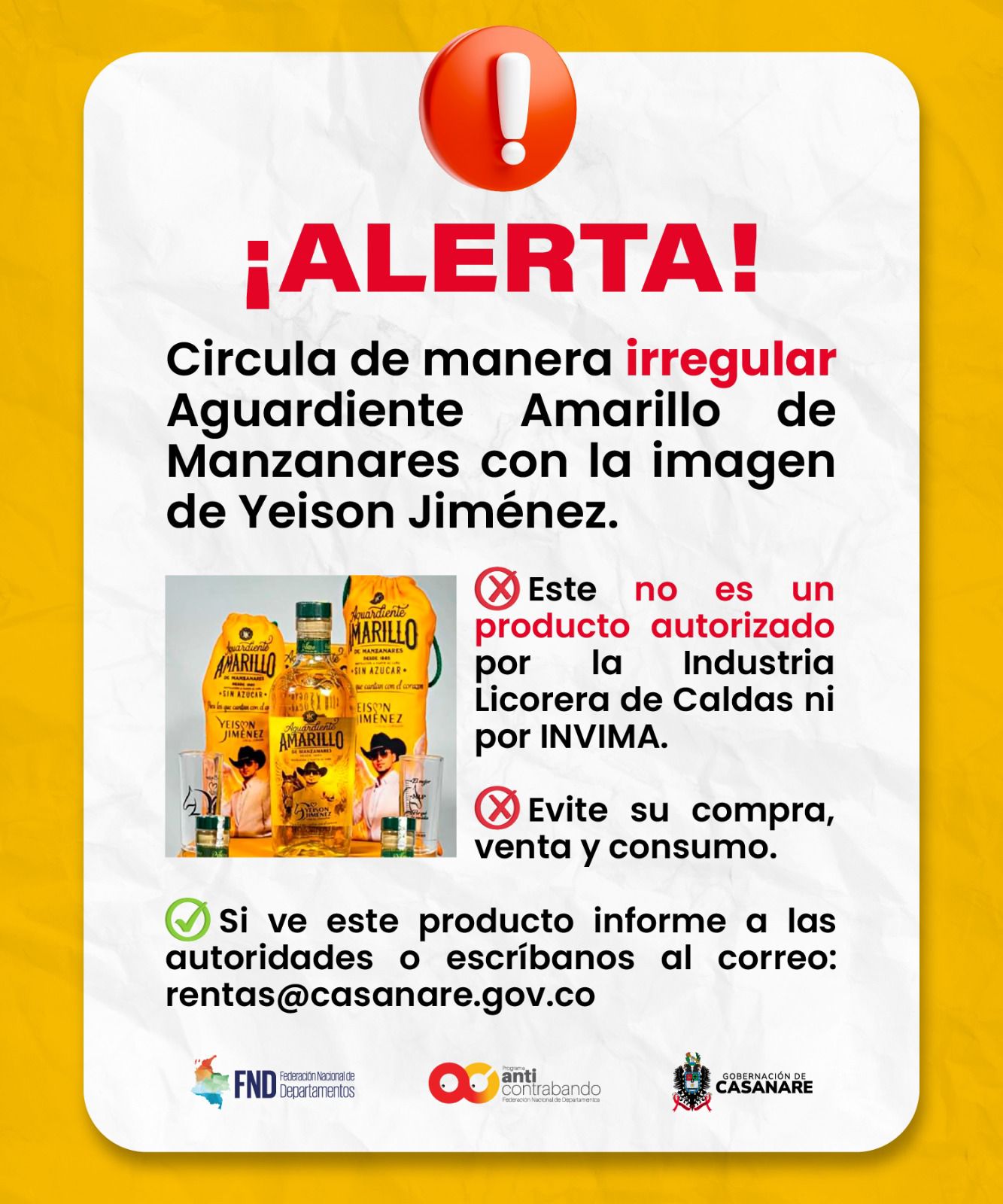 La Secretaría de Hacienda de Casanare hace un llamado urgente a la comunidad para que denuncie cualquier caso de comercialización de Aguardiente Amarillo que utilice la imagen del fallecido artista Yeison Jiménez, ya que se trata de un producto adulterado e ilegal.