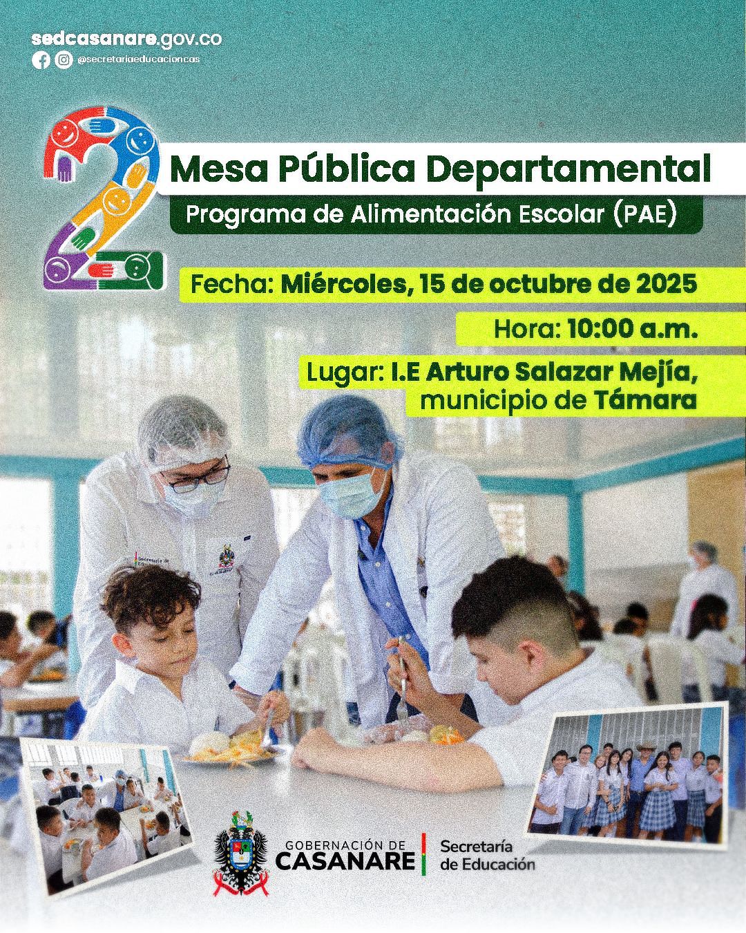 La Institución Educativa Arturo Salazar Mejía, en el municipio de Támara, será el escenario de la Segunda Mesa Pública Departamental del Programa de Alimentación Escolar (PAE), programada para el miércoles 15 de octubre de 2025 a las 10:00 a.m.
